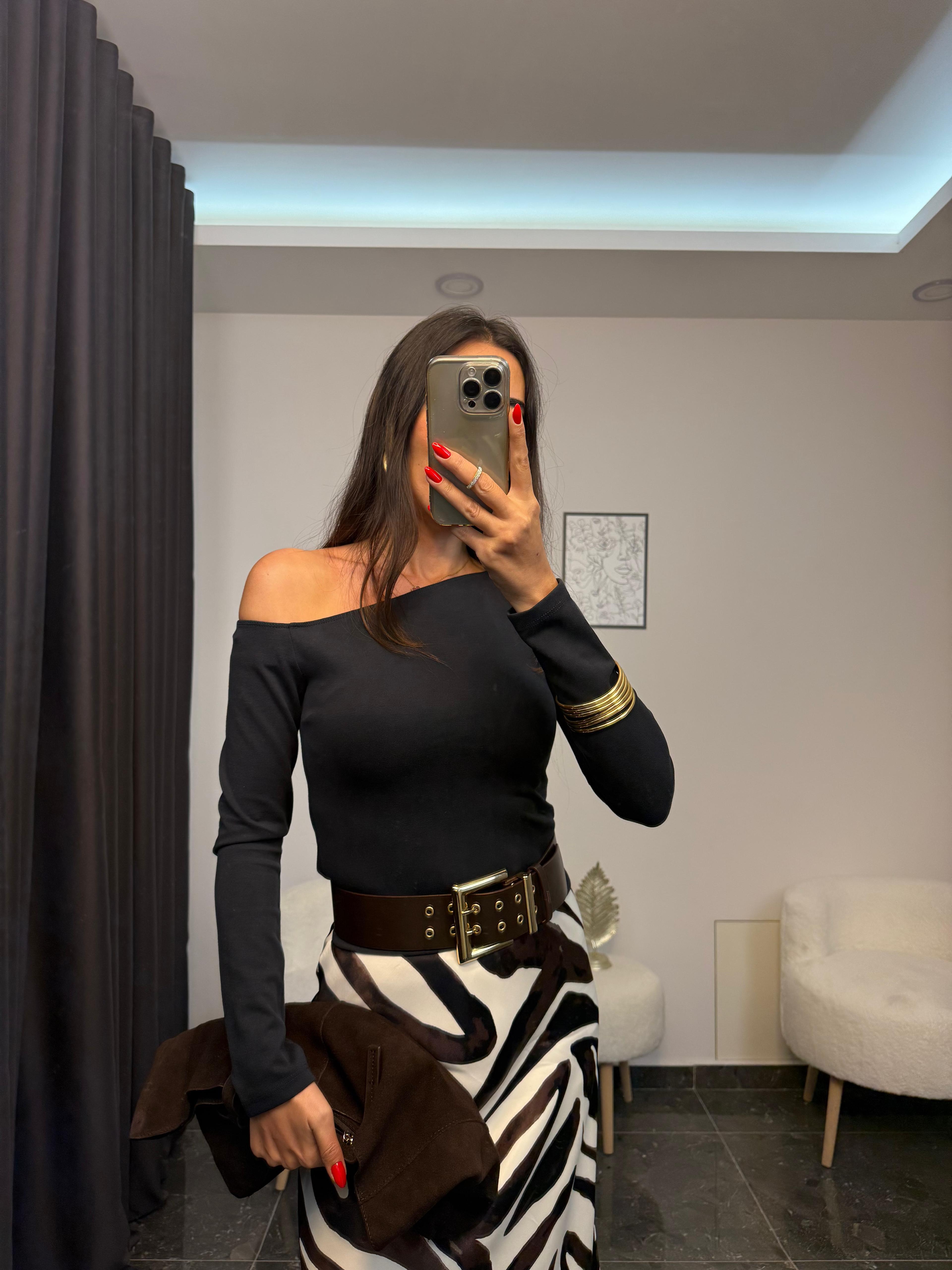 ASİMETRİK YAKA SİYAH ÖRME BLUZ