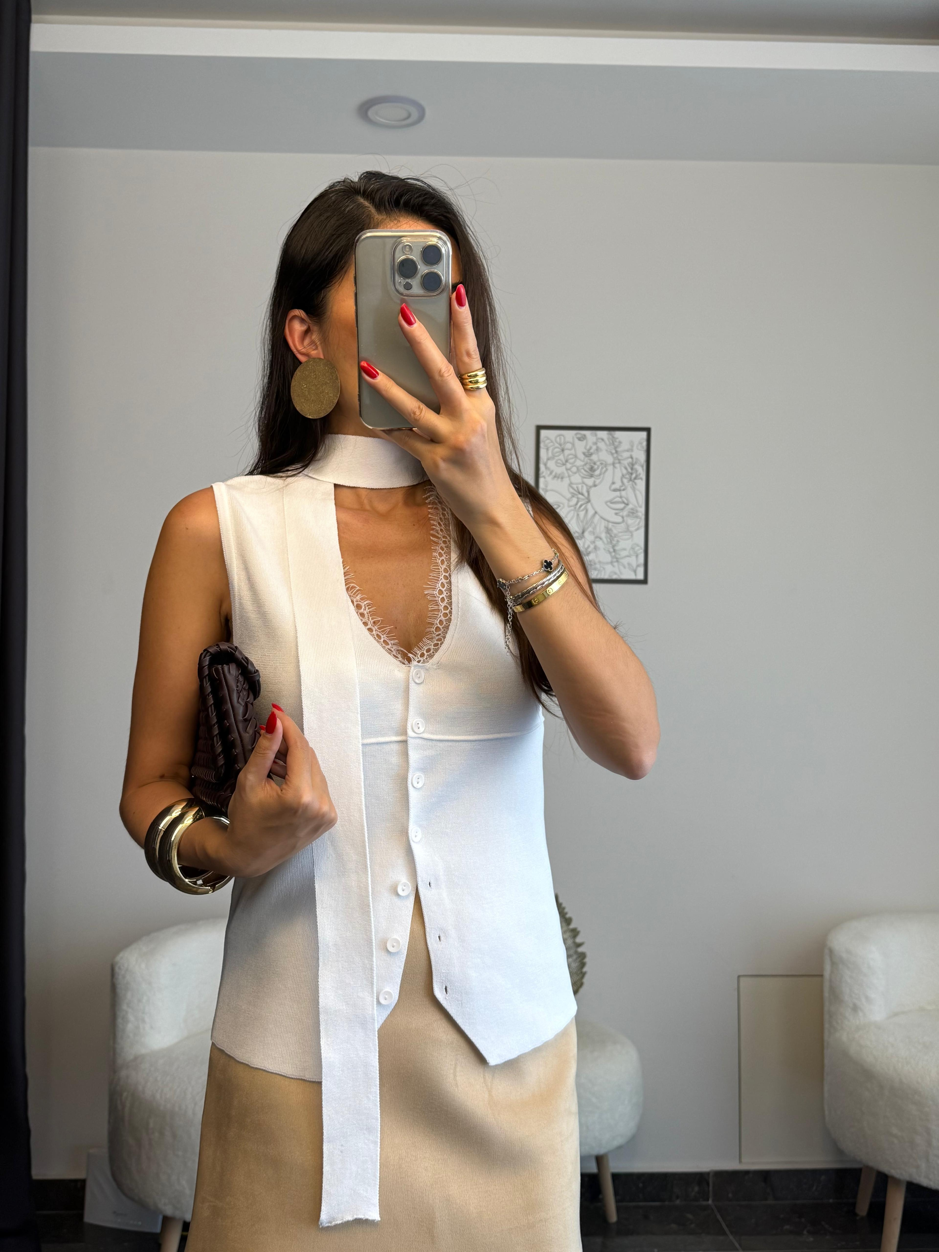 Modern çizgileriyle dikkat çeken beyaz düğmeli yelek bluz, şık detaylarıyla kombinlerinize sofistike bir hava katıyor. Öndeki düğme kapanışı ve düz formu zarif bir görünüm sunarken, şal detayıyla farklı bağlama stillerine imkan verir. Hem günlük kombinlerde hem de özel davetlerde rahatlıkla tercih edilebilecek çok yönlü bir parça.