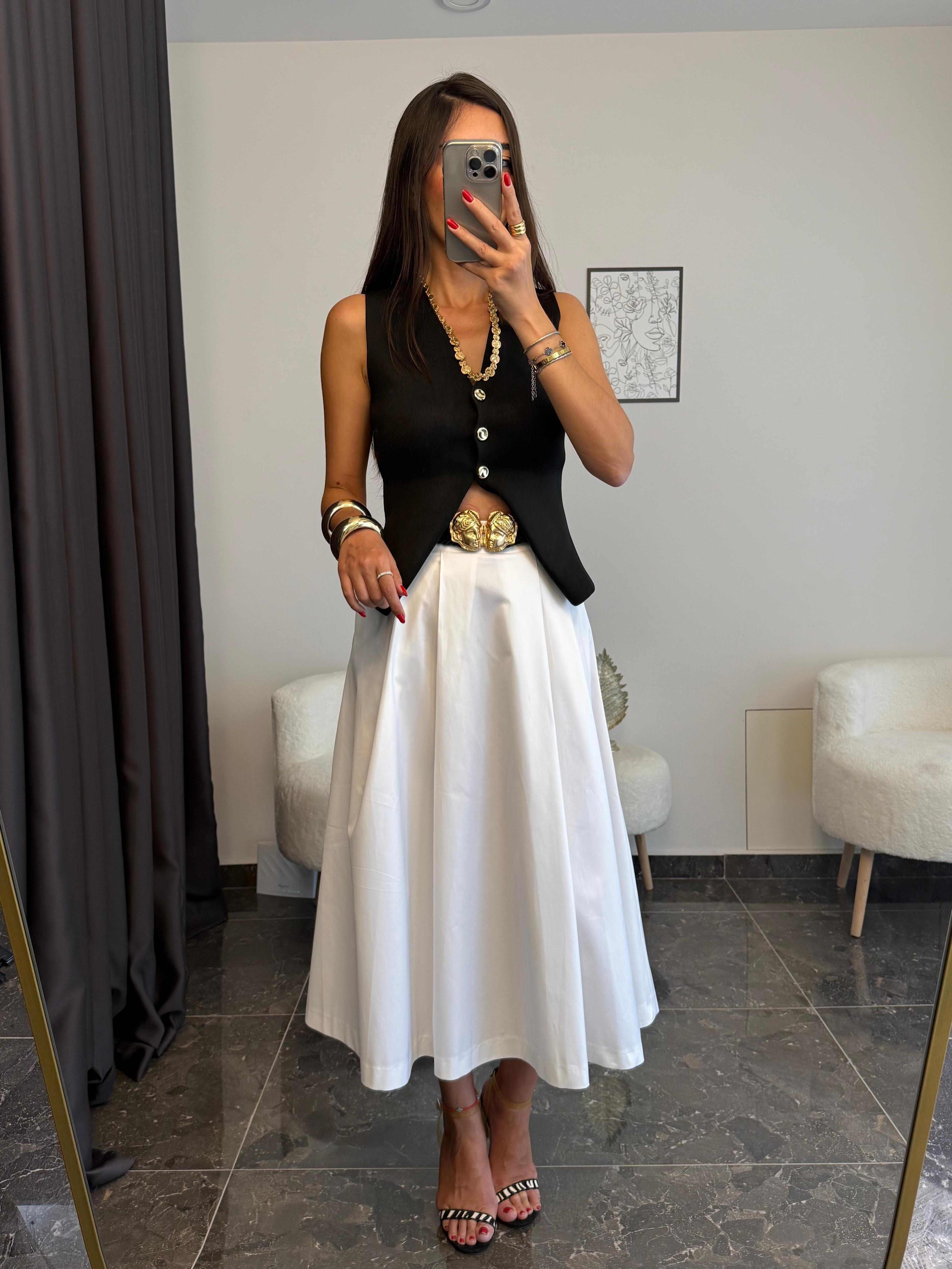 Feminen ve zamansız bir şıklık sunan beyaz midi kloş etek, akıcı kesimi ile rahatlığı ve zarafeti bir araya getiriyor. Hem gündüz hem de akşam kombinlerinde kolayca kullanılabilen bu parça, minimalist tasarımı sayesinde farklı stillere uyum sağlar. Topuklu ayakkabılarla elegan, spor ayakkabılarla ise modern bir görünüm yaratır.