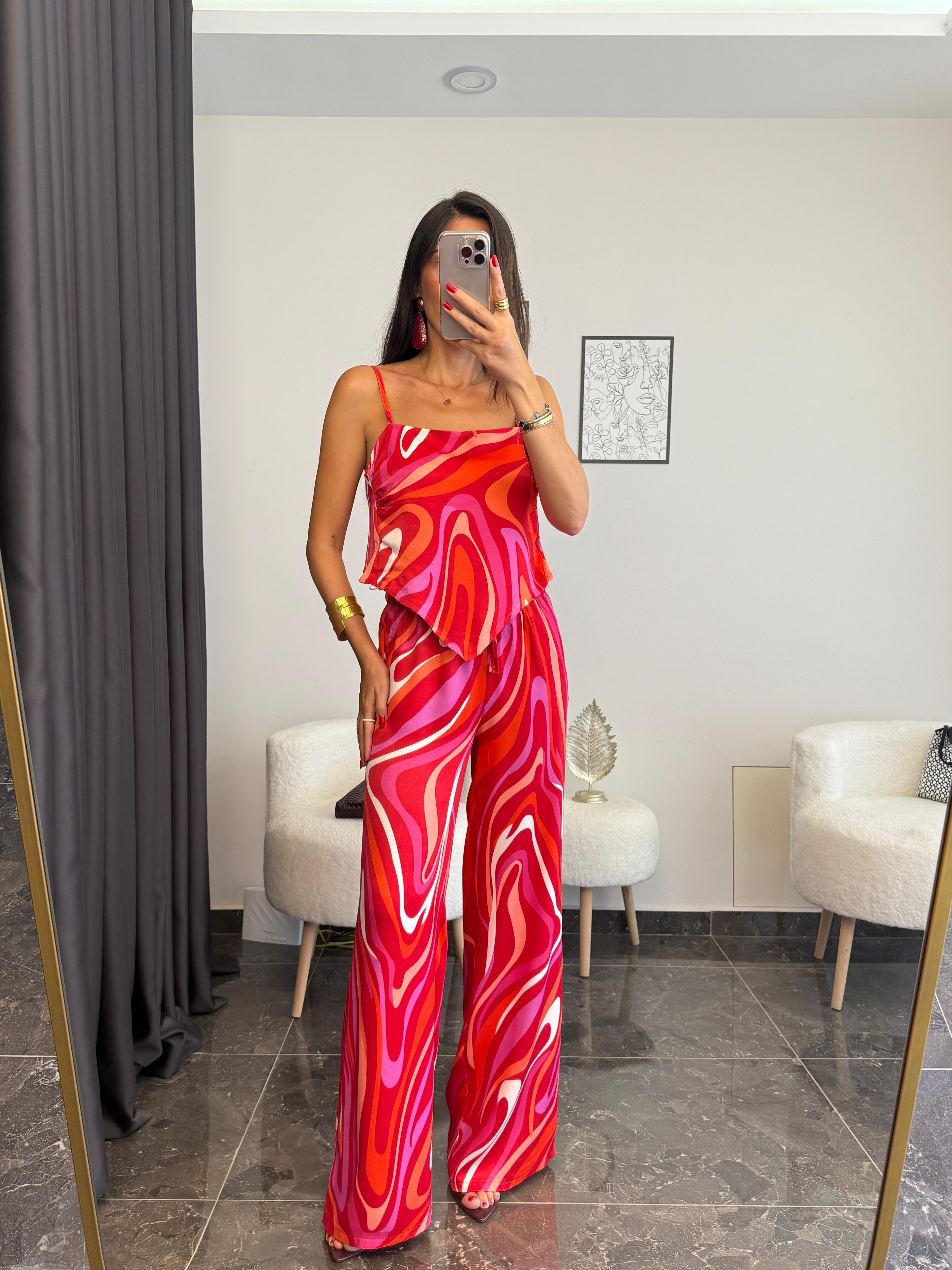 Canlı kırmızı, pembe ve turuncu tonlarıyla tasarlanan bu modern desenli takım, enerjik tarzı ve rahat kalıbıyla yaz sezonunun favorisi olacak. Hafif ve nefes alabilen kumaşı sayesinde gün boyu konfor sunarken, şık kesimiyle hem günlük kombinlerde hem de tatil stilinde öne çıkar. Salaş pantolonun rahatlığı ve asimetrik kesim detaylı üstüyle özgün bir görünüm yakalayabilir, gündüzden geceye her ortamda stilinizi yansıtabilirsiniz Model Ölçüleri: