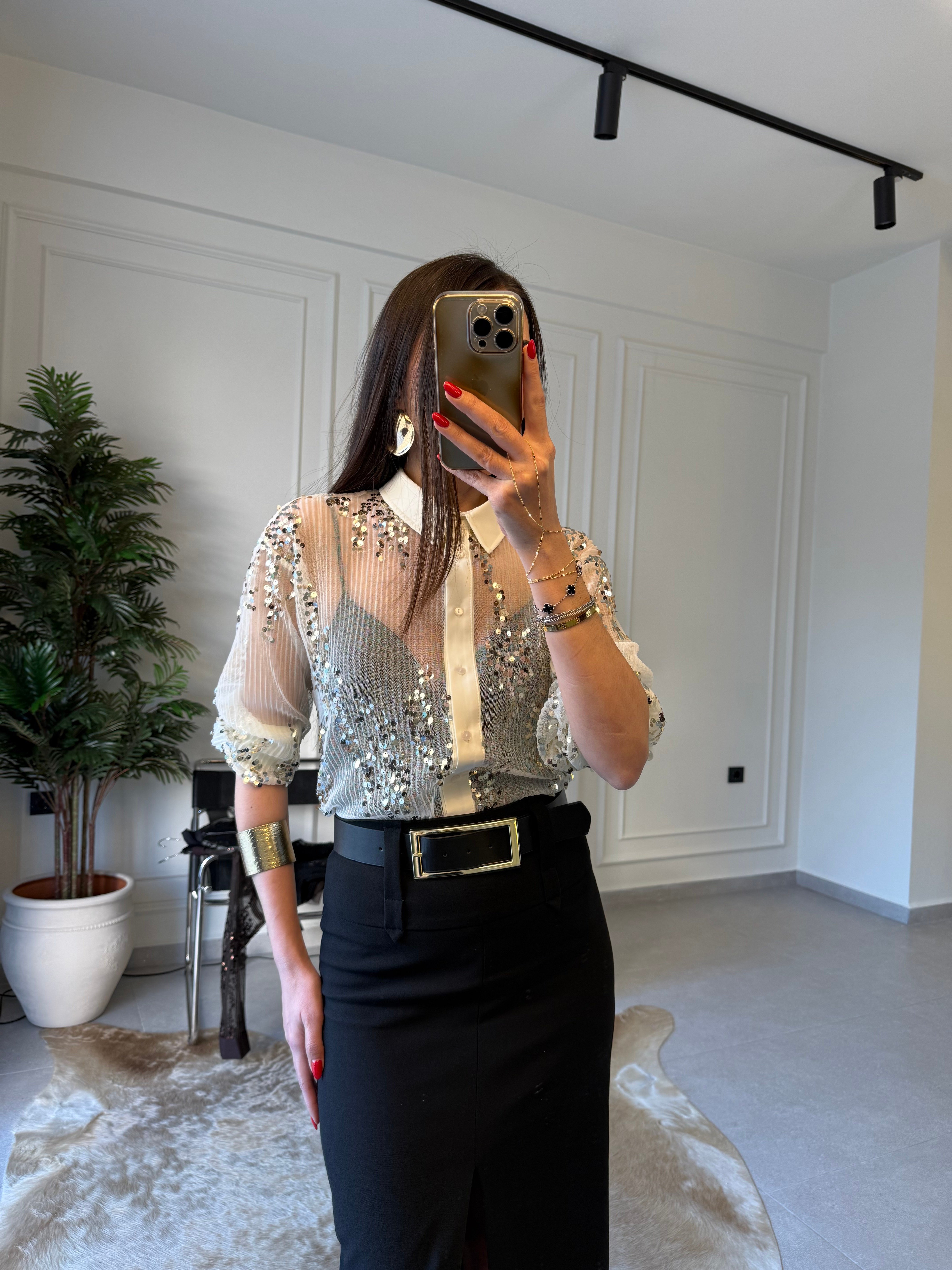 Ekru Pullu Garnilli Gömlek