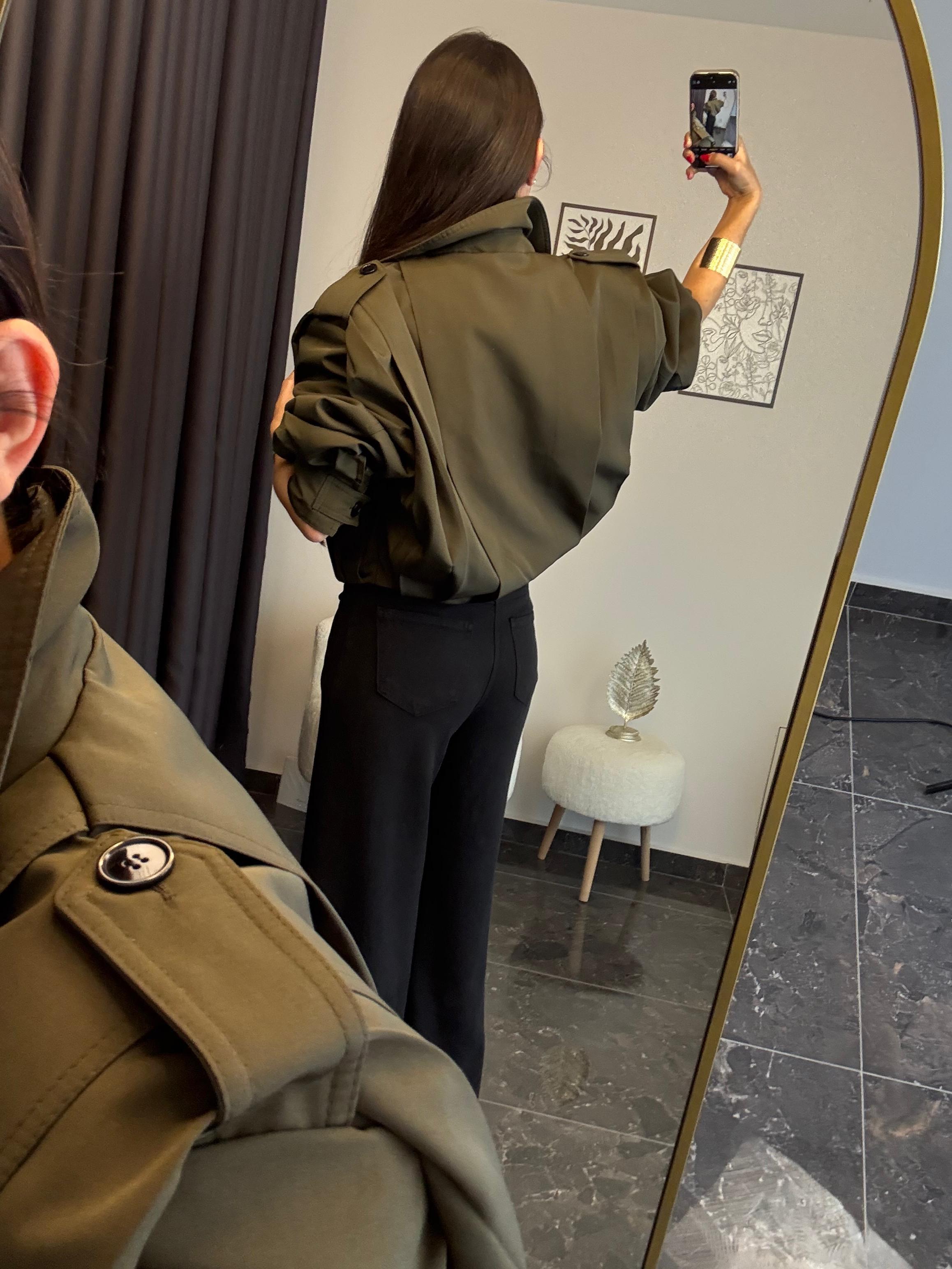 Stil sahibi duruşuyla dikkat çeken haki crop ceket, modern kesimi ve kruvaze düğme detaylarıyla güçlü bir görünüm sunar. Geniş omuz formu sayesinde feminen ve iddialı bir hava katarken, kısa boy tasarımıyla yüksek bel pantolon ve eteklerle mükemmel uyum sağlar. Hem günlük şıklıkta hem de özel davet kombinlerinde rahatlıkla tercih edilebilecek zamansız bir parça.