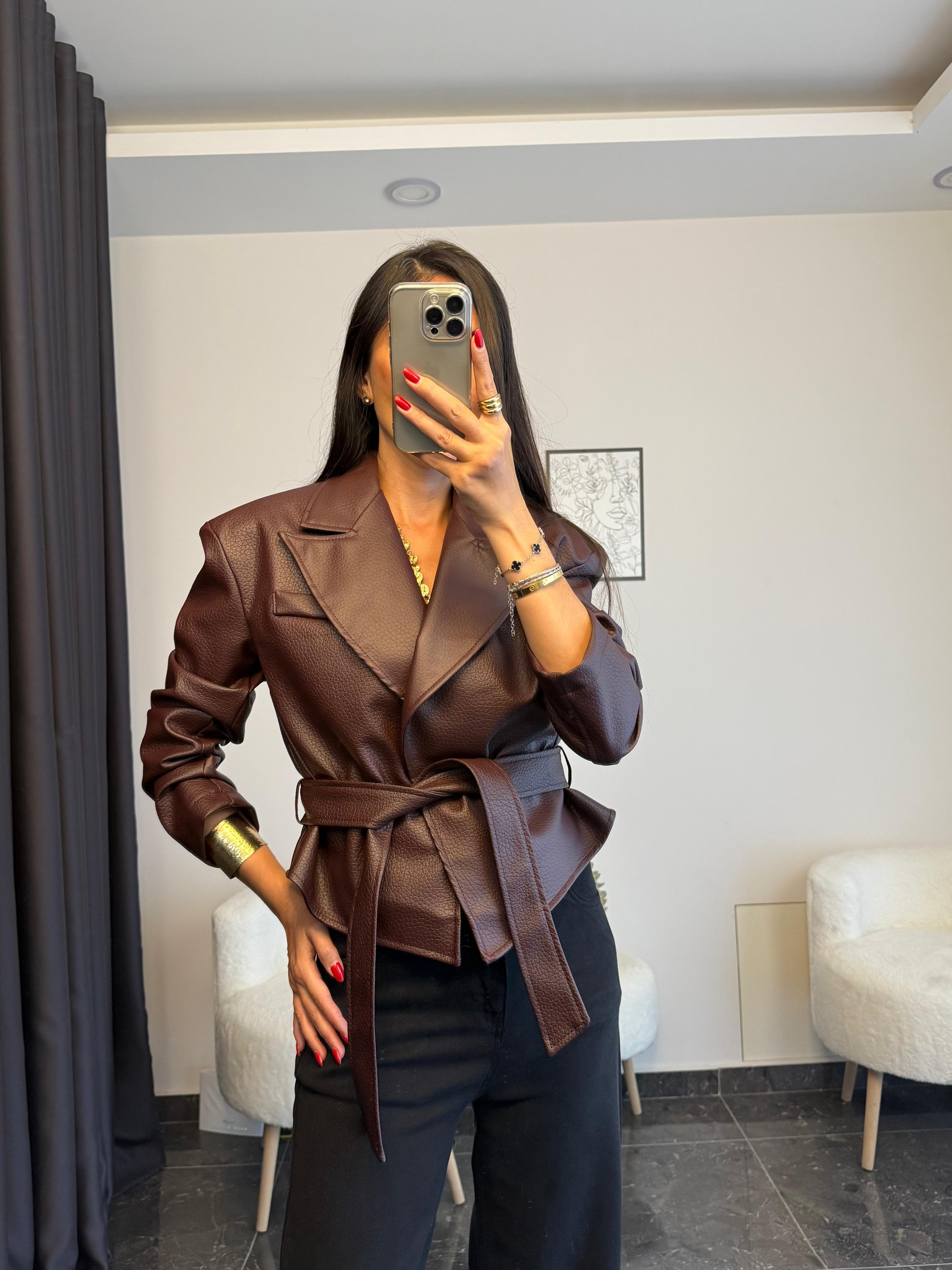 Güçlü ve sofistike bir stil sunan kahverengi deri görünümlü ceket, modern kesimi ve dokulu yüzeyiyle dikkat çekiyor. Geniş yakası ve kemer detayı sayesinde hem feminen hem de iddialı bir duruş kazandırır. Jeanlerle günlük şıklık, elbiselerle ise davet stili için mükemmel bir tamamlayıcıdır.