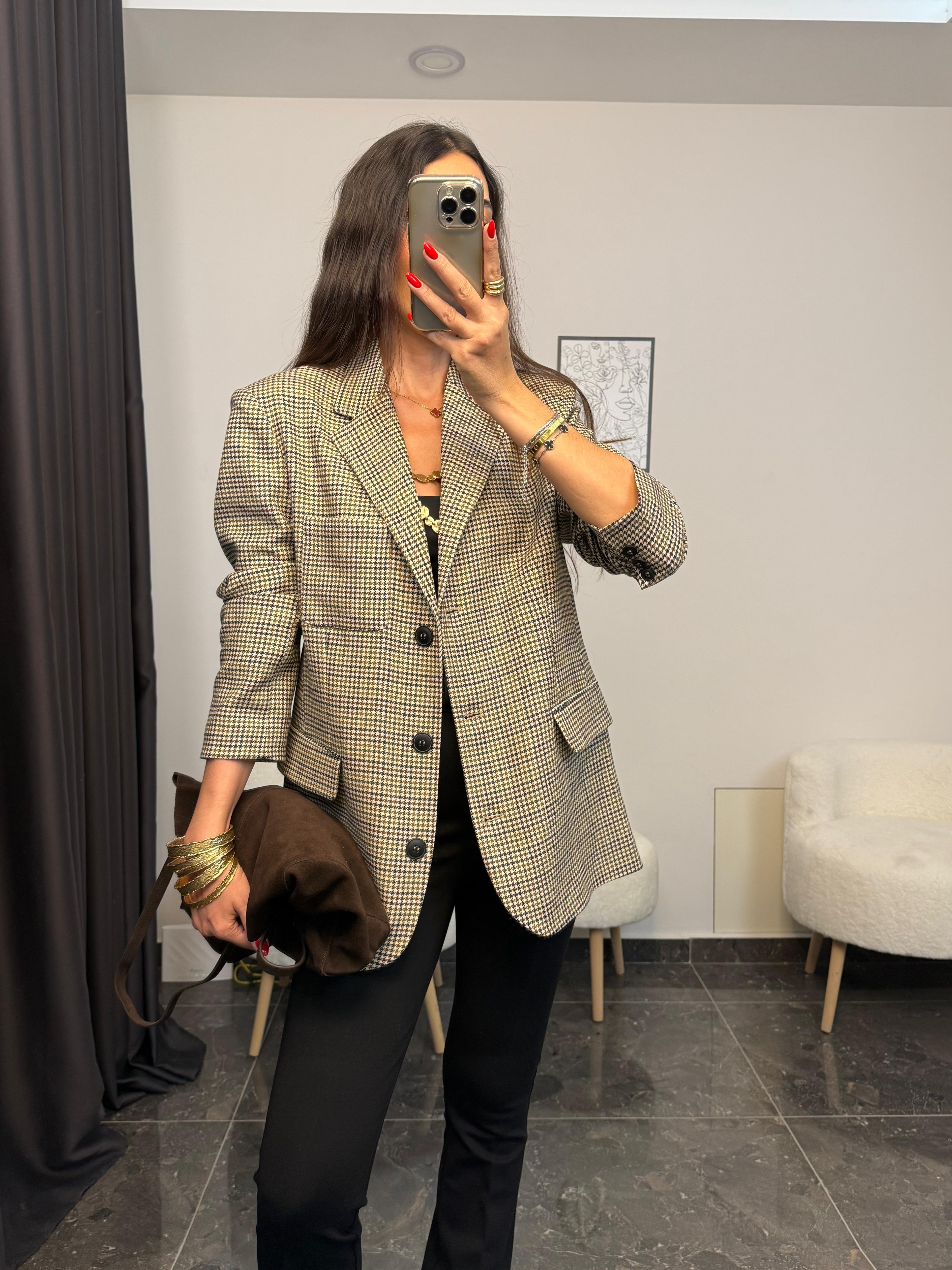 klasik şıklığın modern yorumu! astarlı yapısıyla kusursuz duruş sunan kazayağı desenli blazer ceket ,vatkalı formuyla güçlü bir silüet oluşturur.üç düğmeli,kapak cepli tasarımıyla zarif bir görünüm kazandıran bu model,ofis şıklığından özel davetlere ve günlük kombınlere kolayca uyum sağlar.