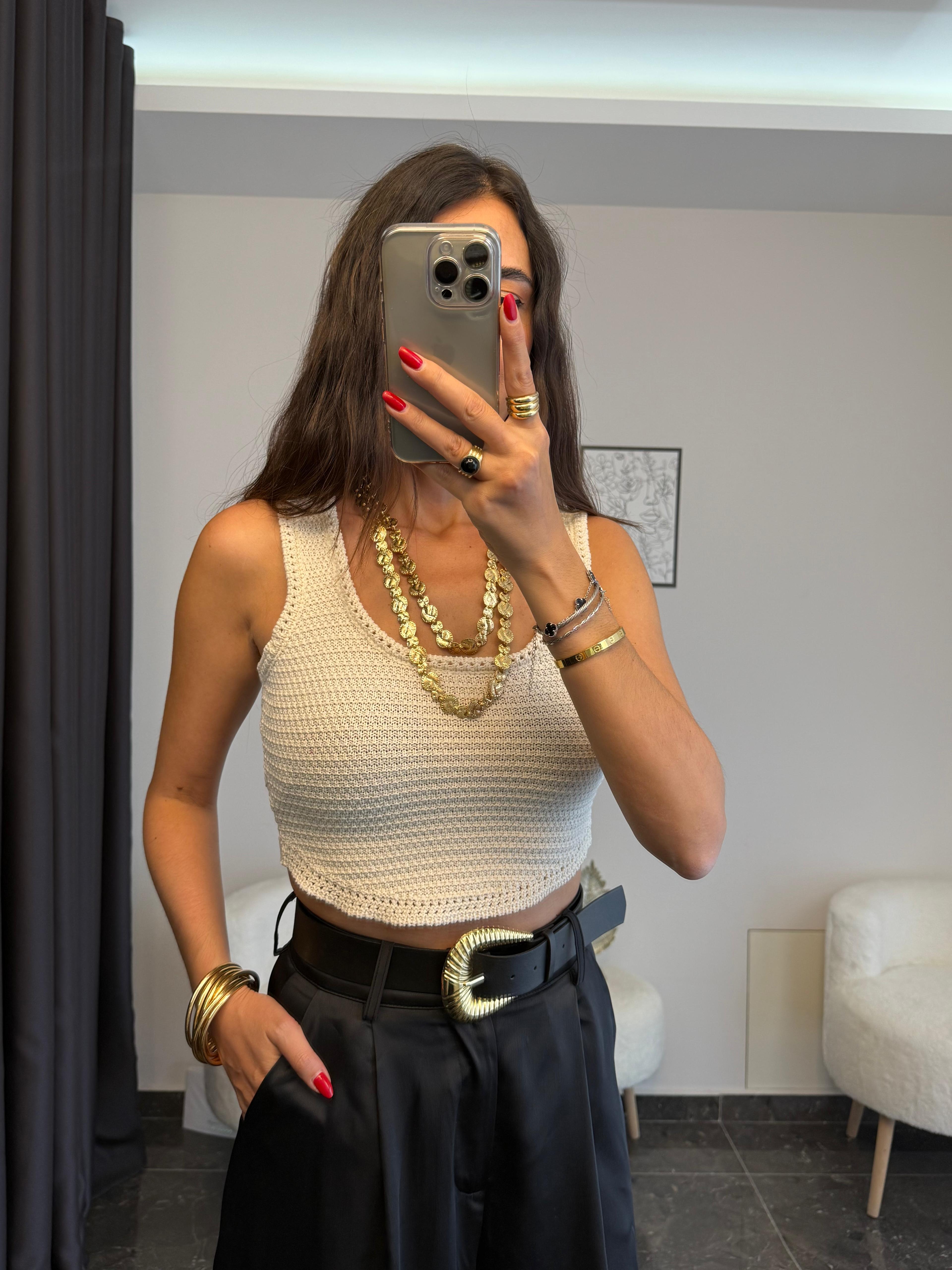 Minimalist tasarımıyla öne çıkan krem renkli örgü crop atlet, yaz kombinlerinin vazgeçilmez parçası. Hafif dokusu ve nefes alan yapısıyla sıcak günlerde konfor sağlarken, modern kesimi sayesinde jean, şort ya da eteklerle kolayca kombinlenebilir. Zamansız rengiyle hem günlük kullanıma hem de şık davetlere uyum sağlar.