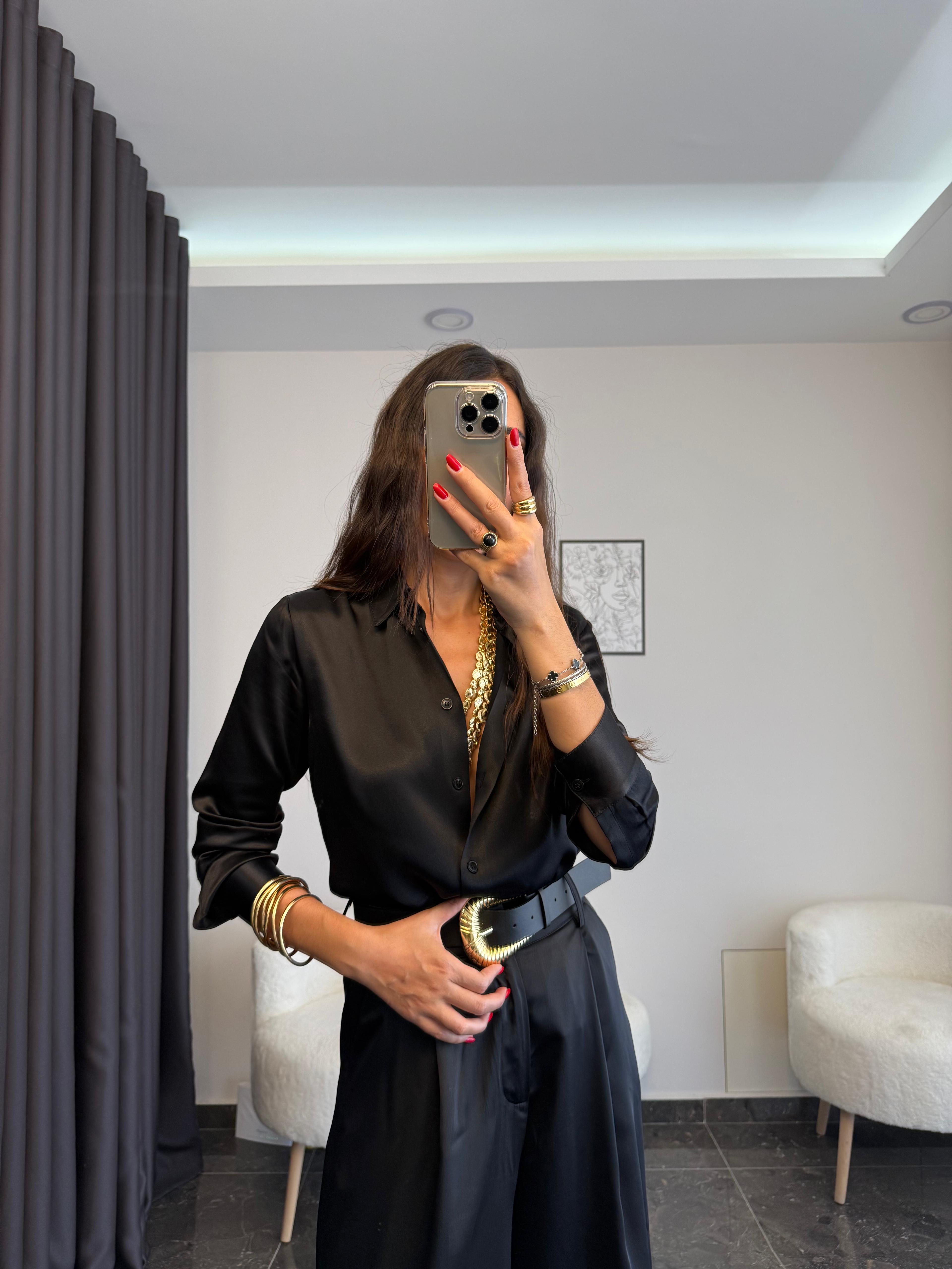 Zamansız şıklığın anahtarı siyah saten gömlek, yumuşak dokusu ve ışıltılı kumaşıyla hem gündüz hem gece kombinlerine sofistike bir hava katar. Düğme detaylı klasik kesimi, modern dokunuşlarla yeniden yorumlanırken, rahat kalıbı sayesinde gün boyu konfor sunar. Kumaşın doğal parlaklığı, takılarla ve kemerle tamamlandığında etkileyici bir stil ortaya çıkarır.